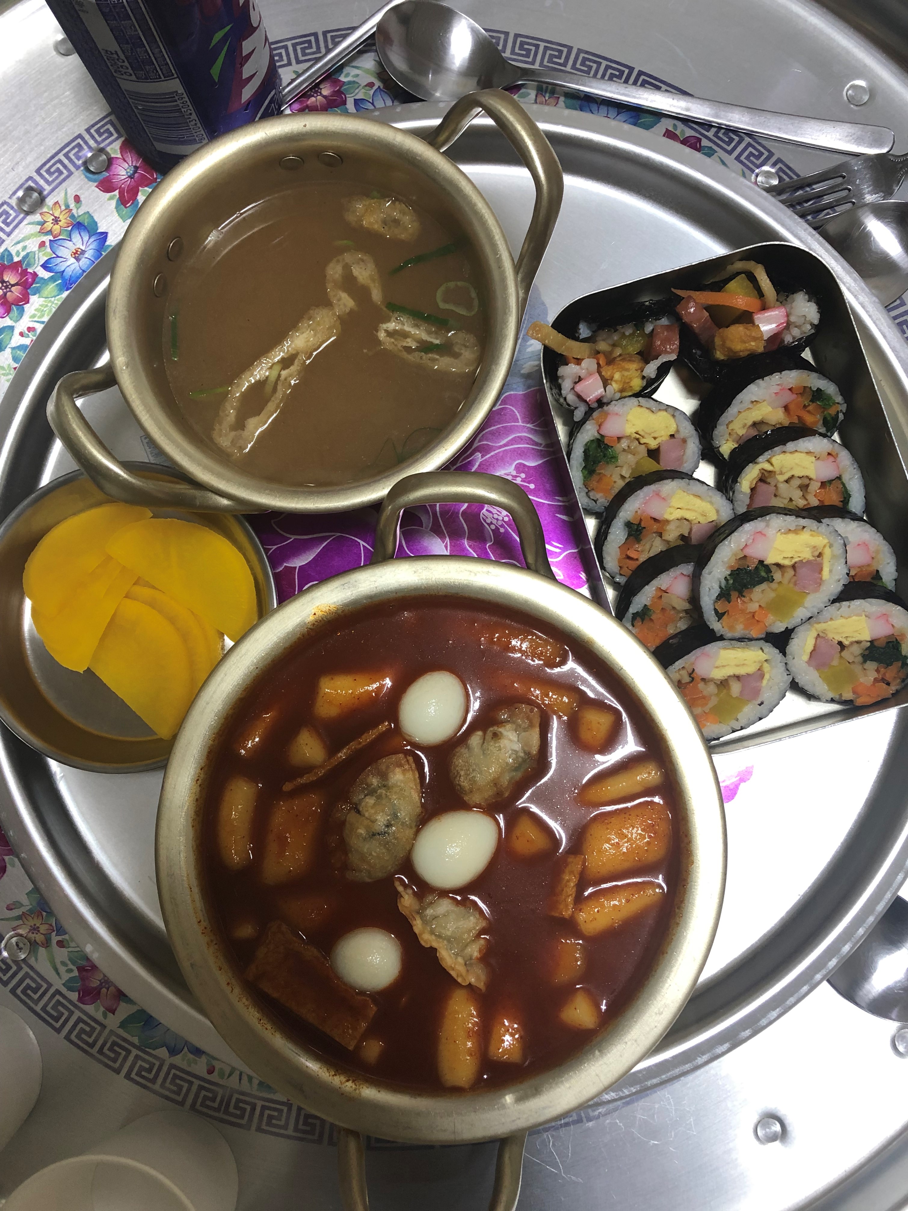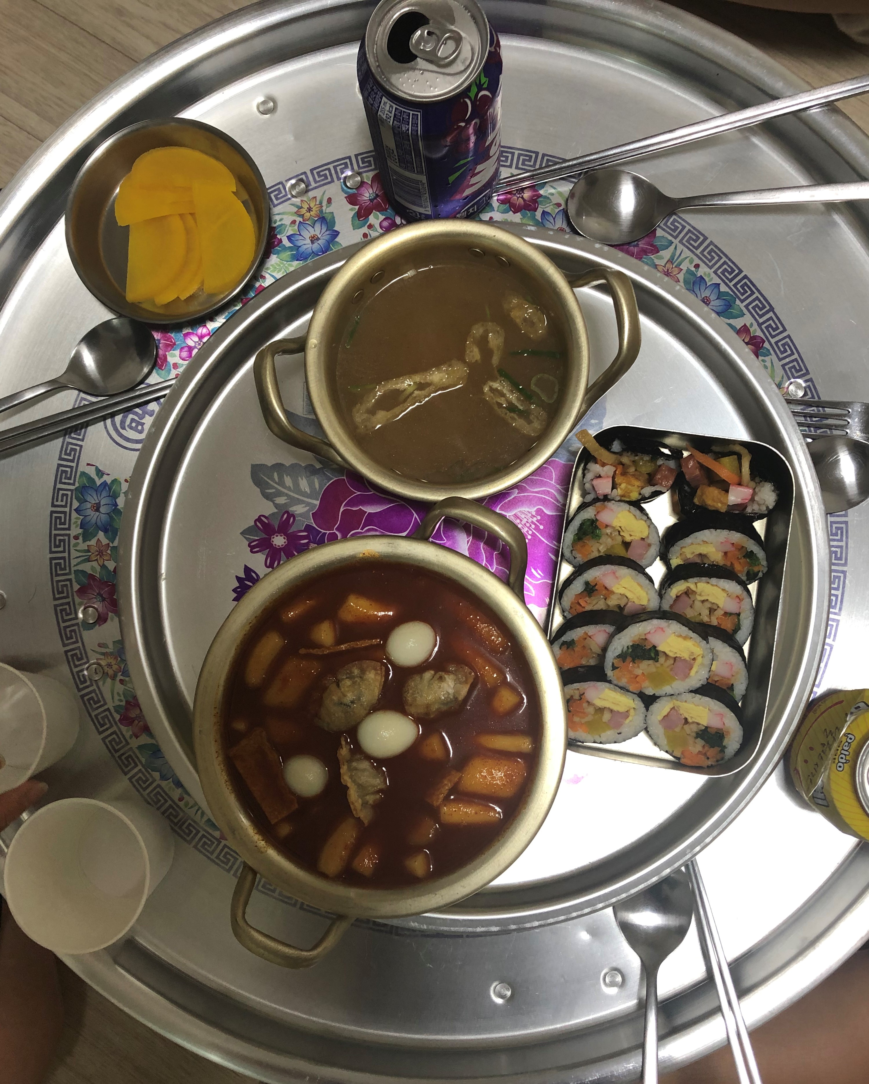첫 번째 음식은 떡볶이, 김밥이 나왔습니다. 어묵 국물은 서비스예요.