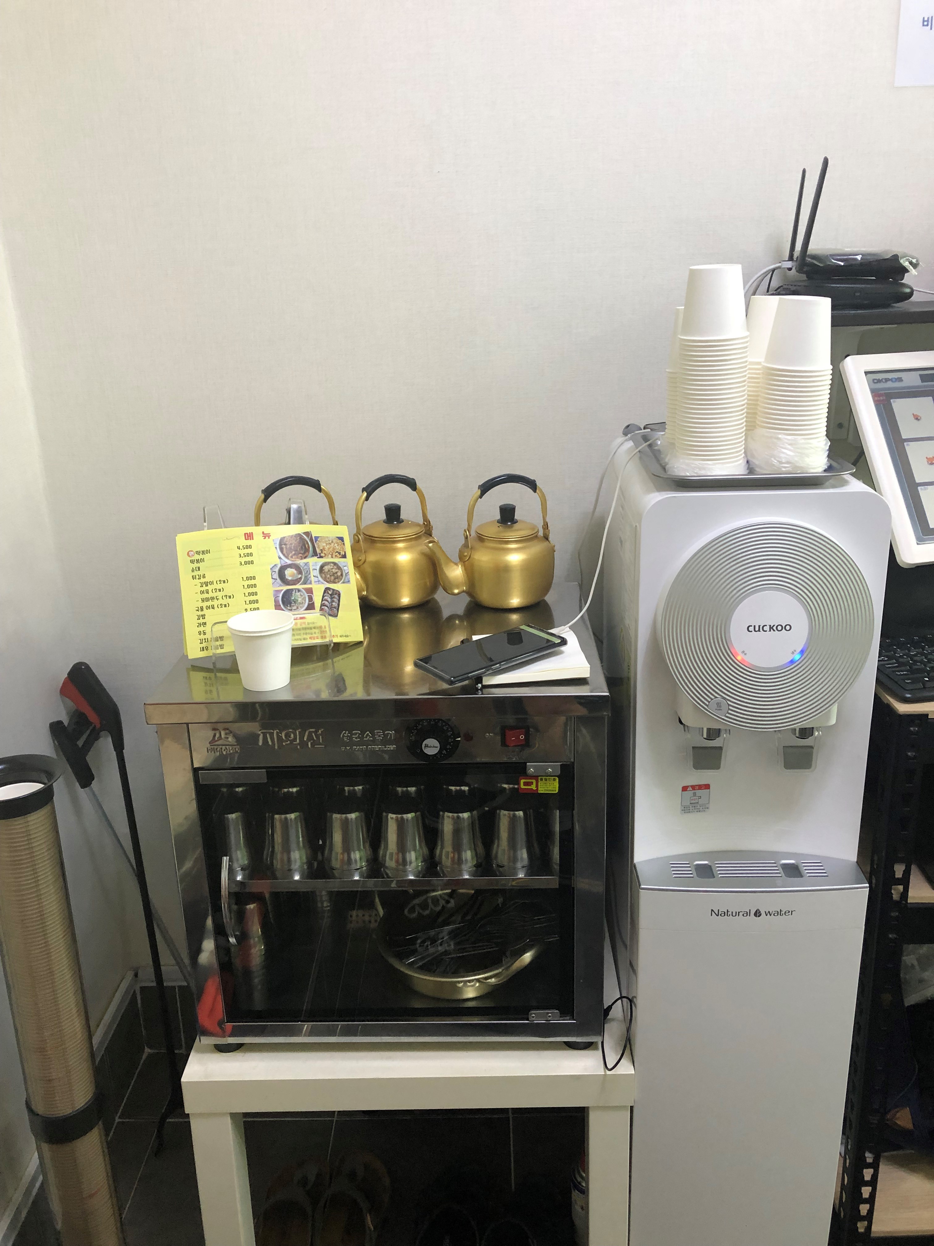 그집 떡복이 맛집의 테이블형 홀과 좌식 방 사이에는 셀프 식수대 및 음료수 냉장고가 비치되어 있어서
