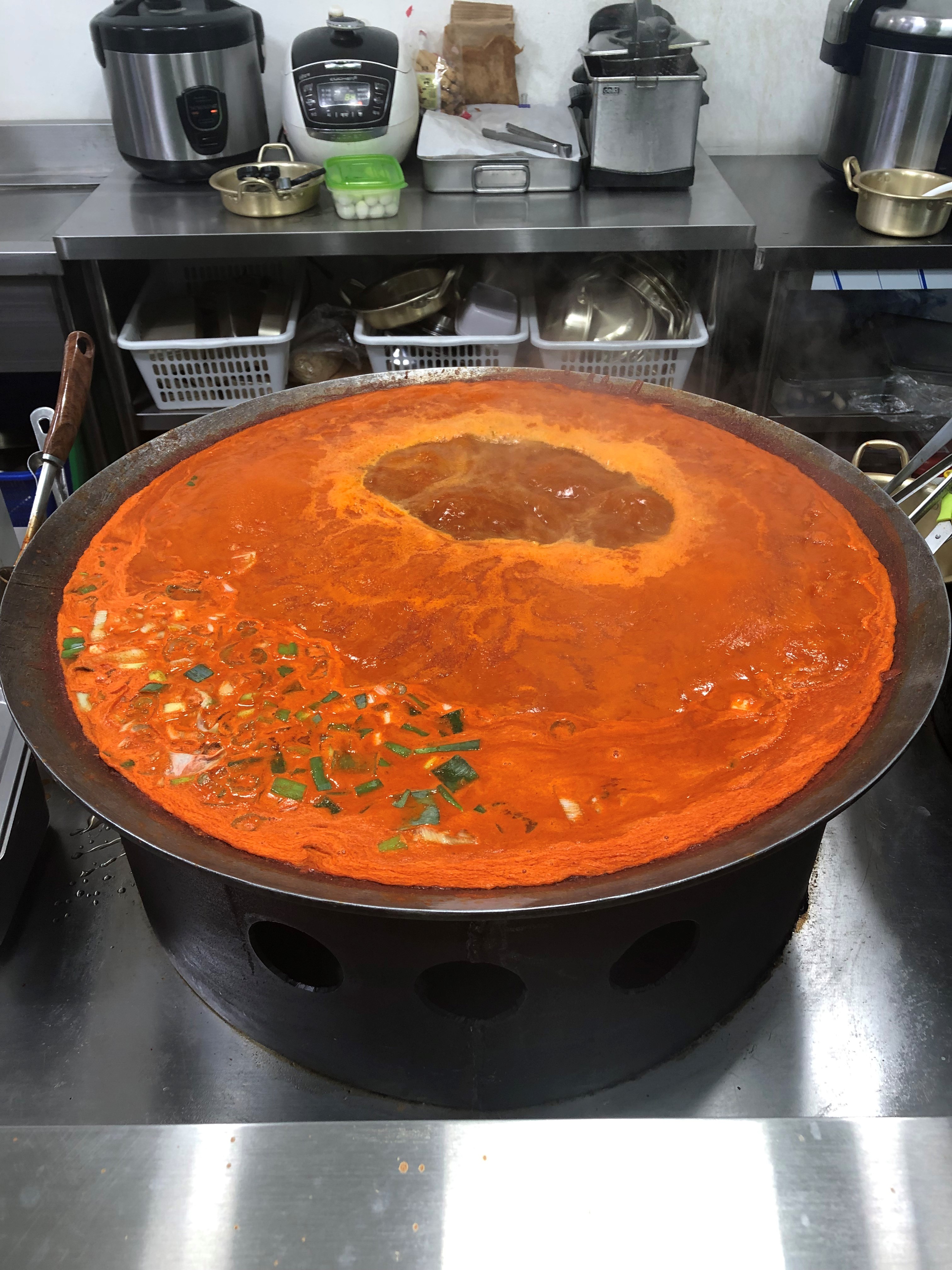 중국음식집에서 흔히 보게 되는 솥뚜껑 형식의 두꺼운 그릇에 떡과 떡볶이용 양념과 같이 끓여서 맛있는 떡볶이 국물을