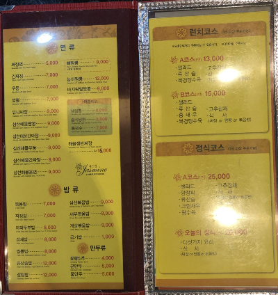 강원도 맛집 원주 쟈스민 중국집 메뉴에는 면류, 밥류, 육류, 잡품류, 새우류가 있고 코스 요리에는 런치 코스와 정식 코스의 두 가지 코스의 세트 메뉴가 있습니다.