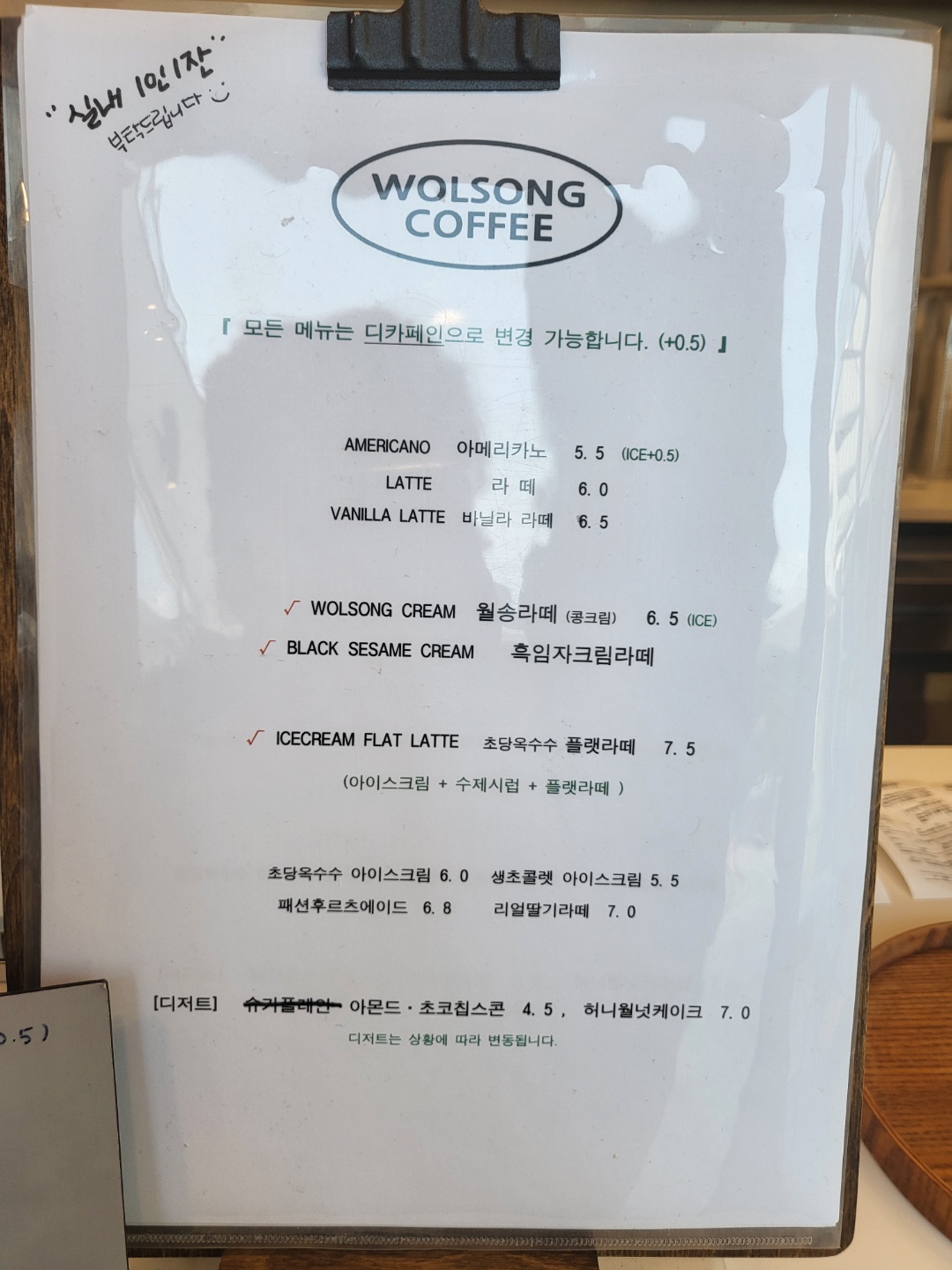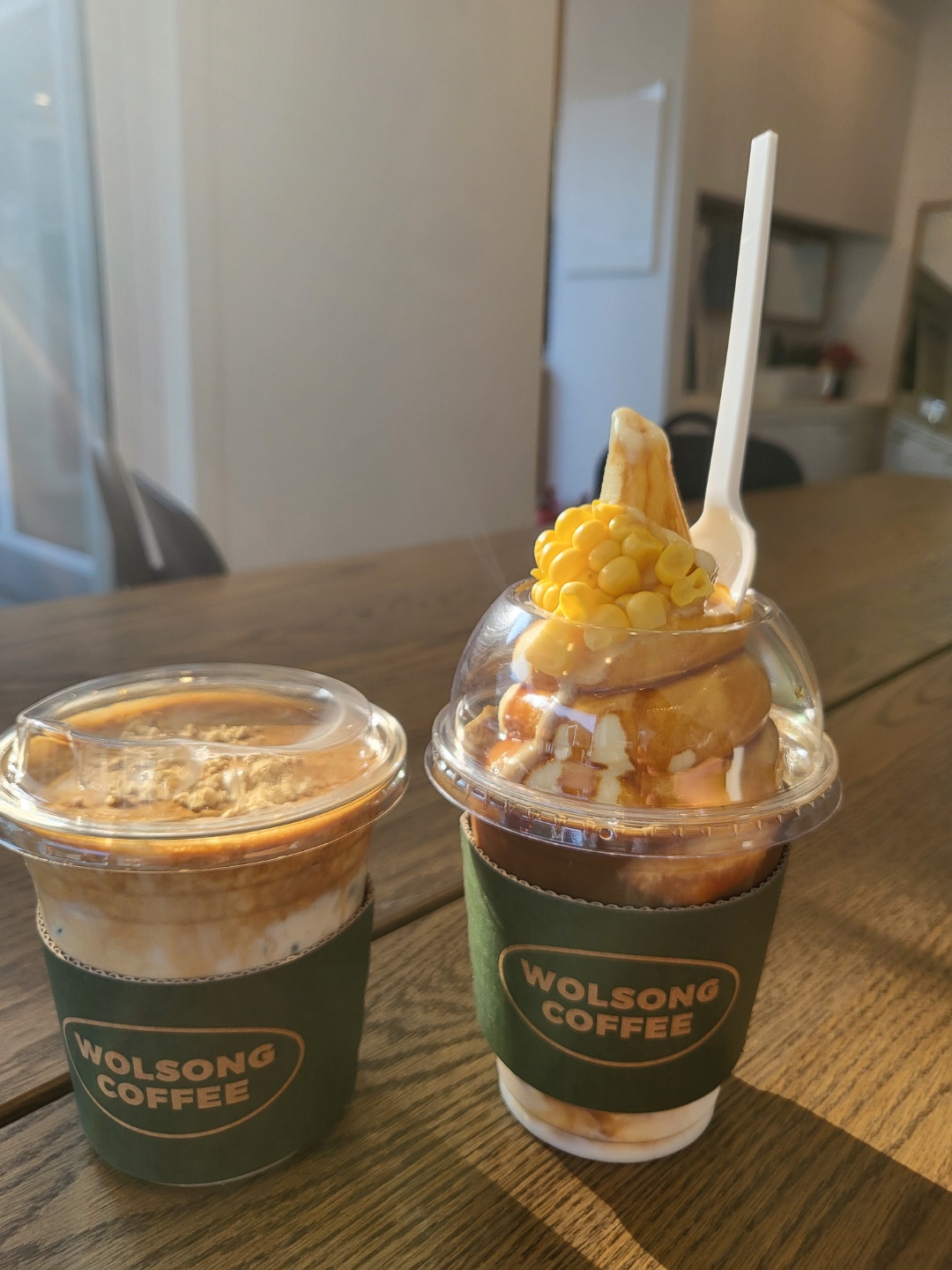 오늘은 커피 메뉴 선택은 월송 라테, 초당옥수수 플랫 라테 주문하였습니다.