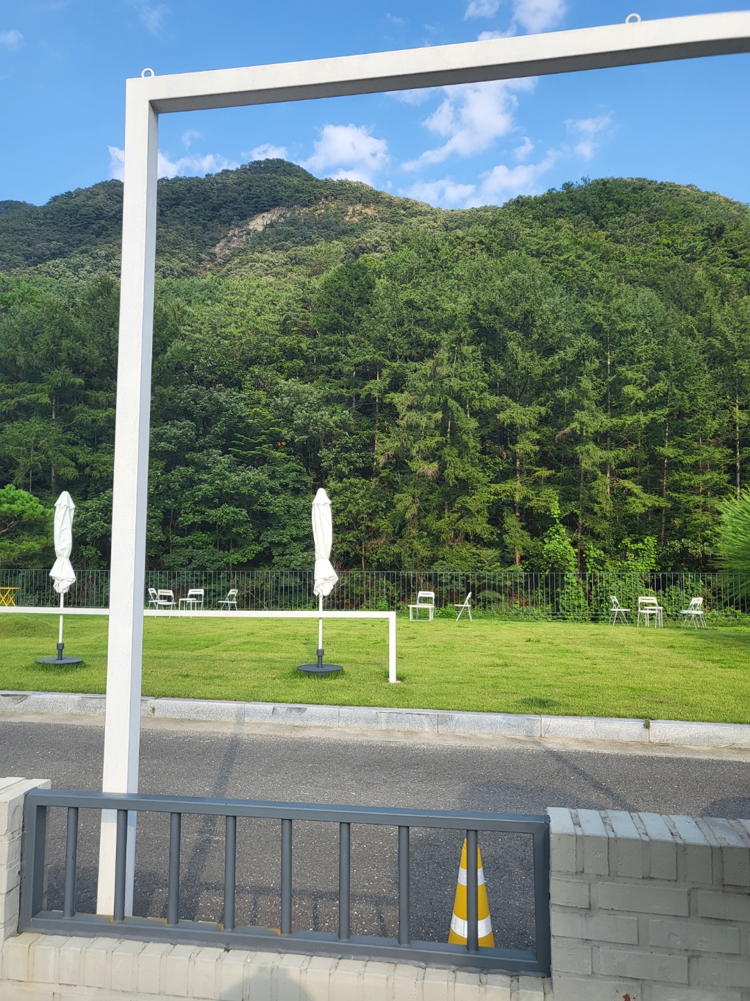 크지는 않지만 통유리창에 푸른 하늘과 푸른 산을 보면서