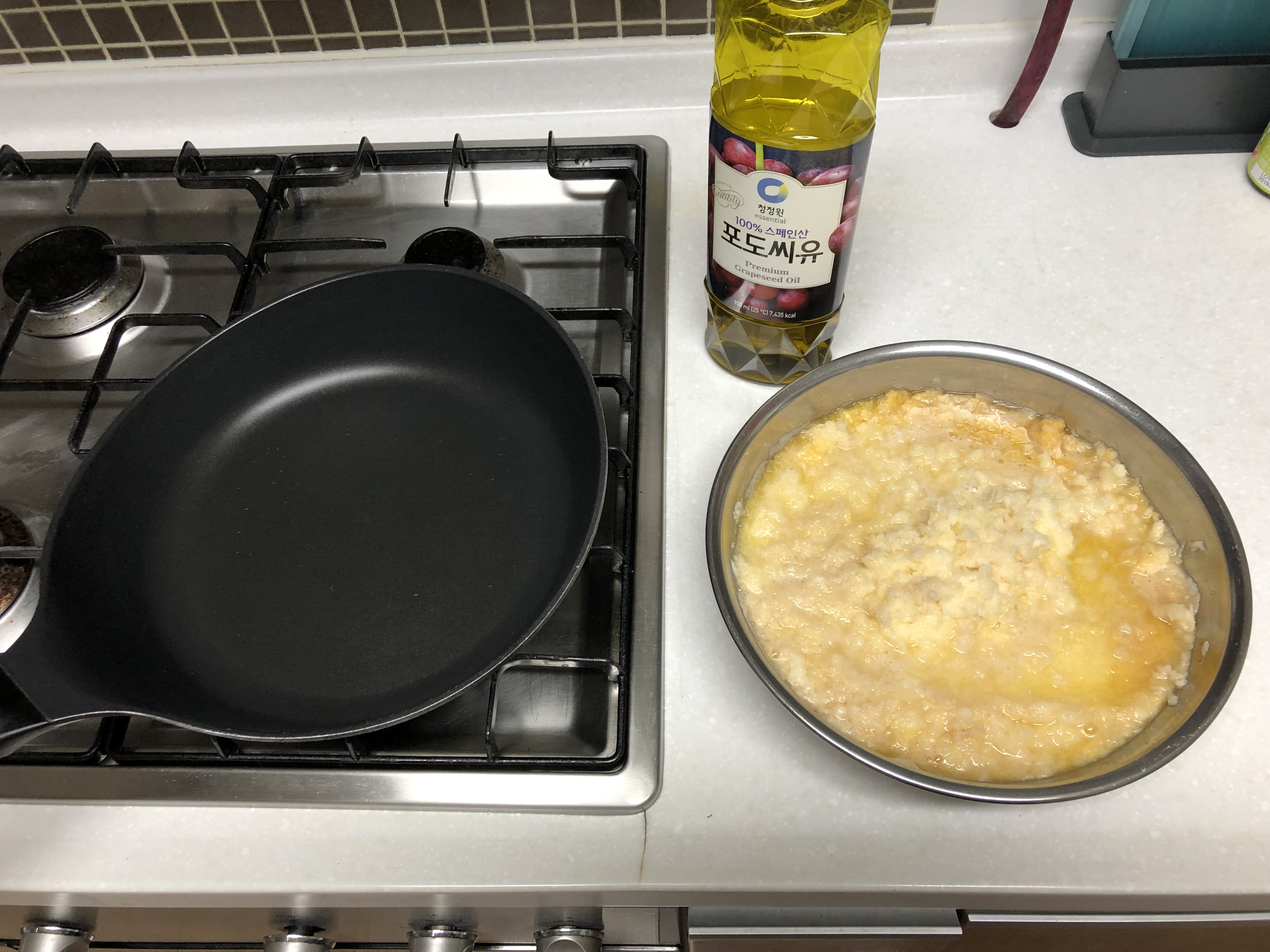 3. 강판에 간 감자전분에 물을 빼고, 프라이팬과 포도씨유 기름을 준비합니다.