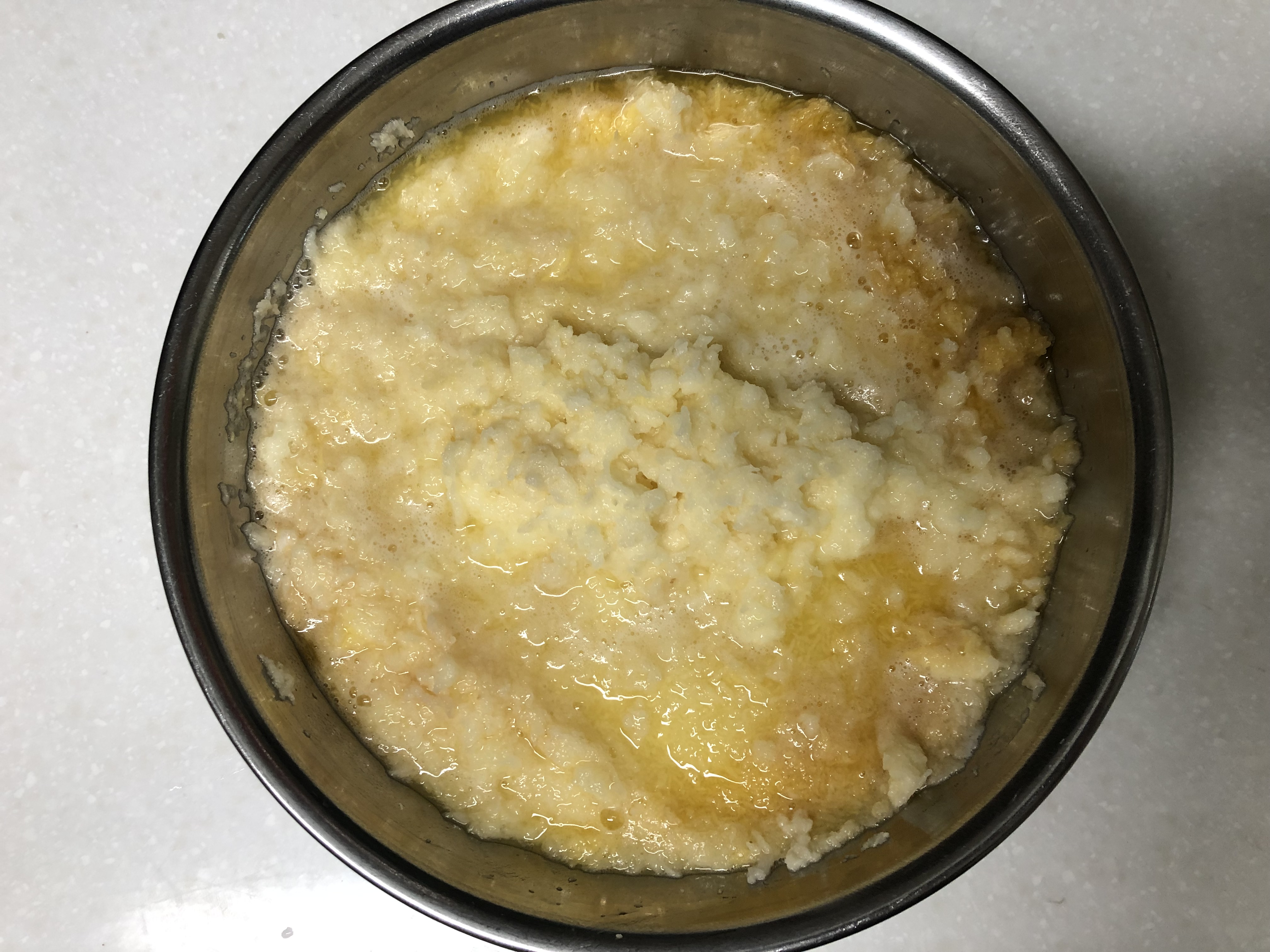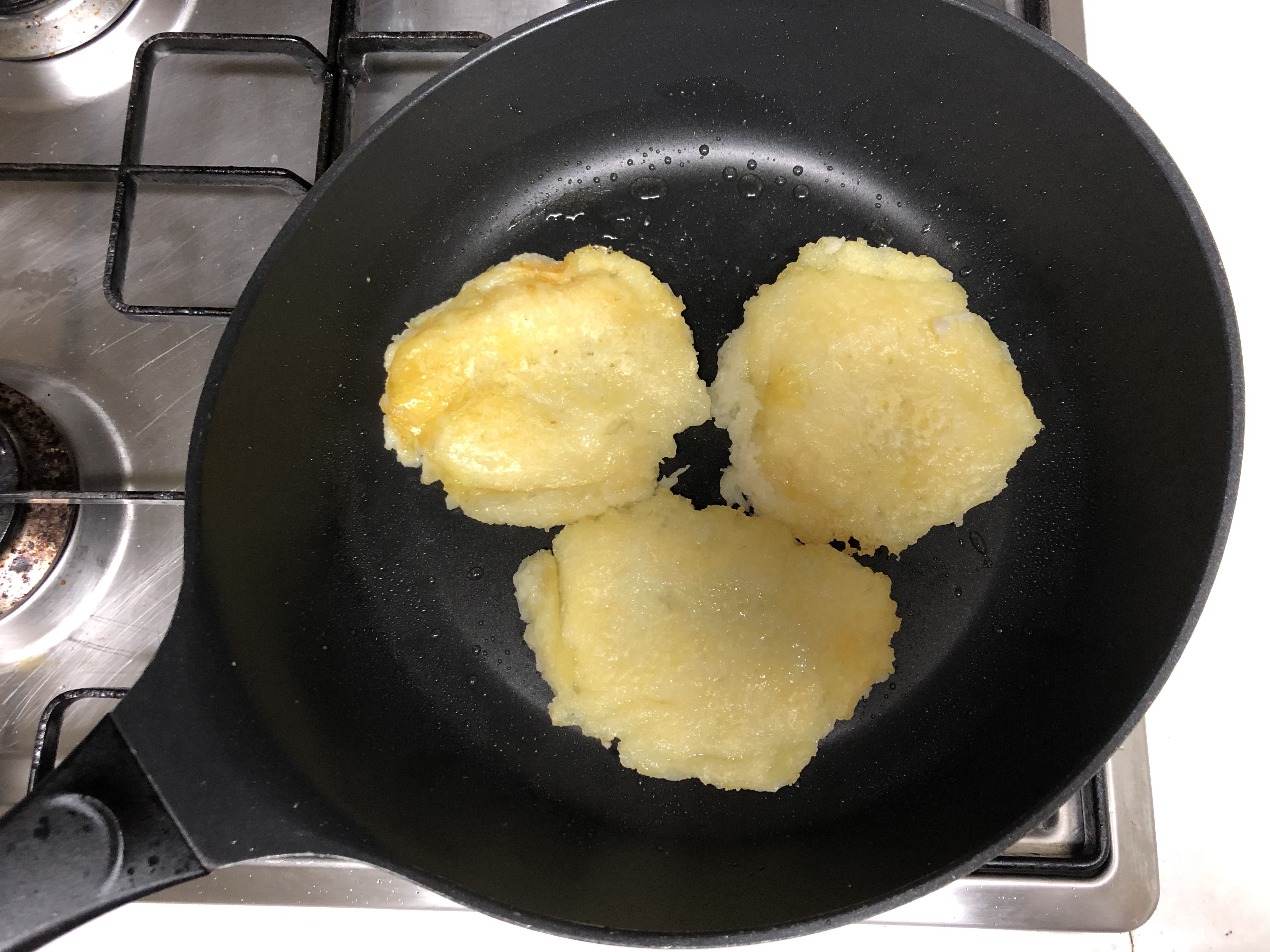 4. 프라이팬이 열을 가하고 기름을 두른 다음 감자전분을 올려서 적당한 크기와 두께로 펴보겠습니다.