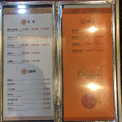 강원도 맛집 원주 쟈스민 중국집 메뉴에는 면류, 밥류, 육류, 잡품류, 새우류가 있고 코스 요리에는 런치 코스와 정식 코스의 두 가지 코스의 세트 메뉴가 있습니다.