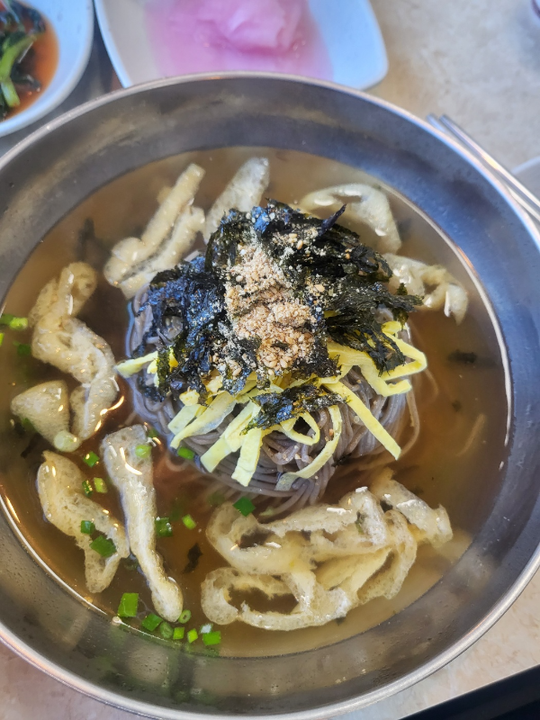 계절음식으로 따뜻하고 국물에 깊은맛이 나는 메밀온면.