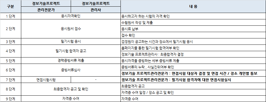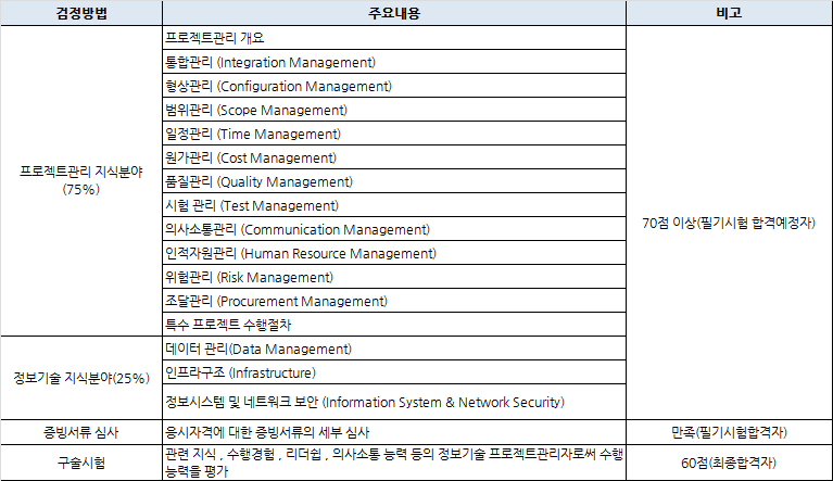 ☞ 자격기준 : 정보기술 프로젝트관리전문가 자격검정은 프로젝트관리지식과 프로젝트 수행에 필요한 정보 기술지식"로