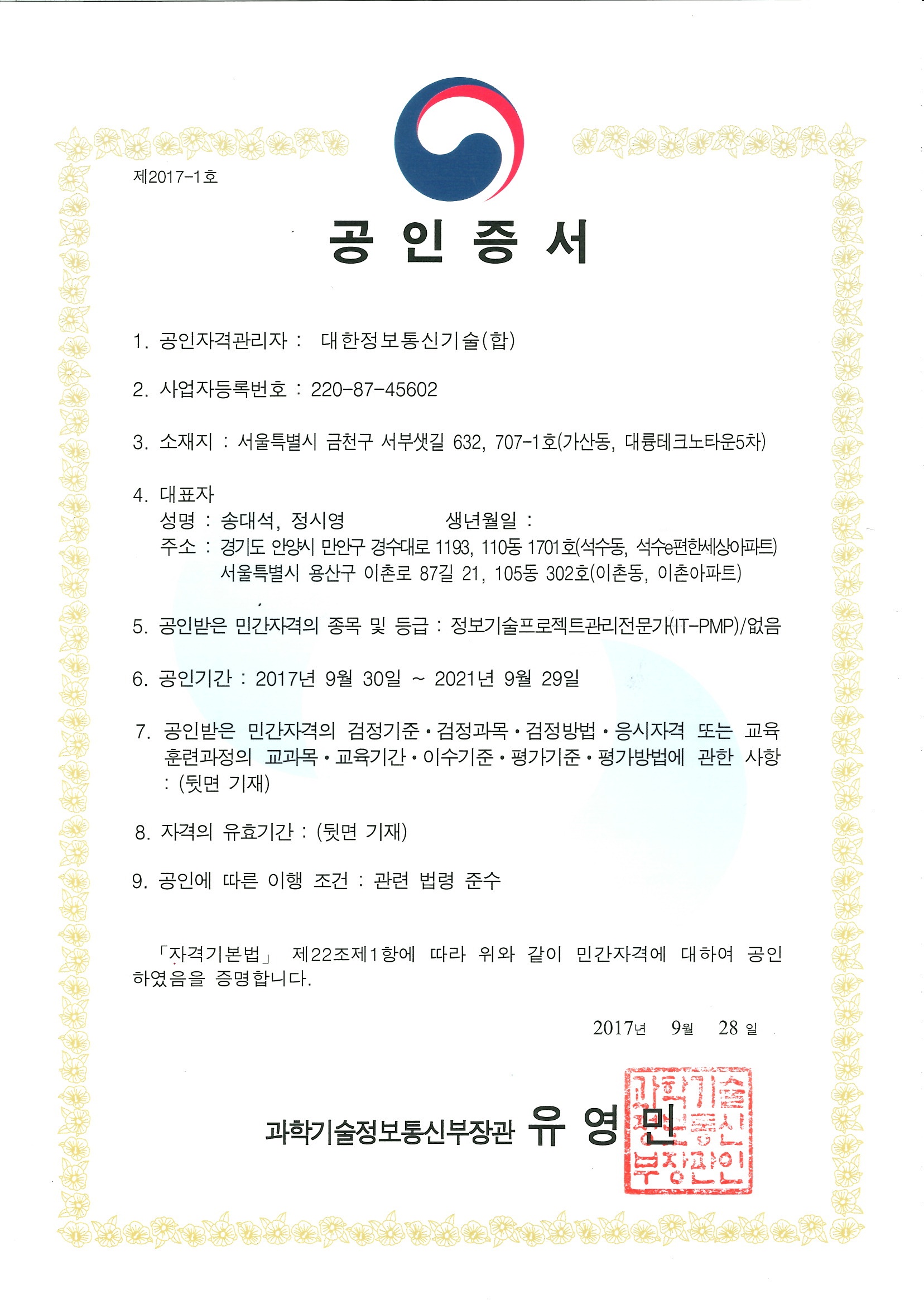 이론 및 실무경험을 바탕을 둔 대한정보통신기술은 공신력있는 전문기관이고,