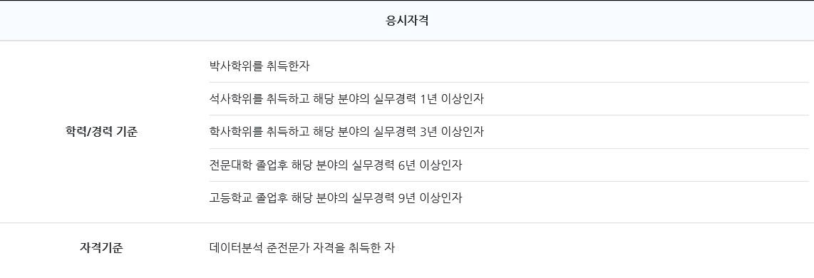 데이터분석 전문가 자격검정 시험의 응시자격은 아래표와 같고, 필기시험일 이전에 응시자격 요건이 충족되어야 합니다.