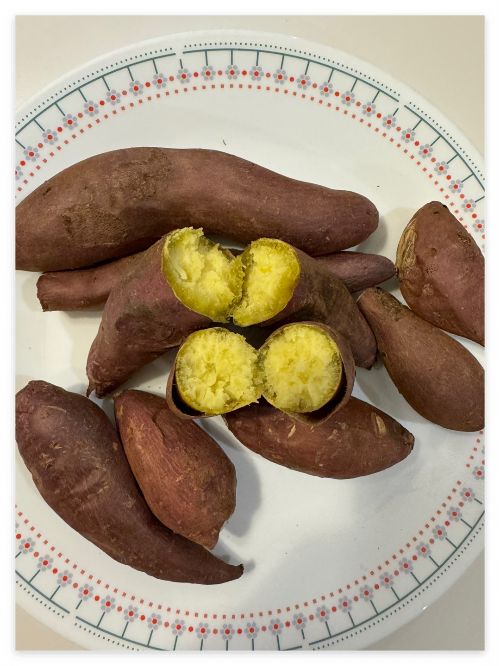 받자마자 작은 크기가 많이 있어 놀라긴 했지만 호박/밤고구마보다 섬유질이 많고 고소한 밤과 달콤한 꿀같이 속이 노랗고 당도가 있는 큰 장점이 있어 작은 크기는 문제가 안되었다. 맛만 좋다면야 크기가 문제인가??