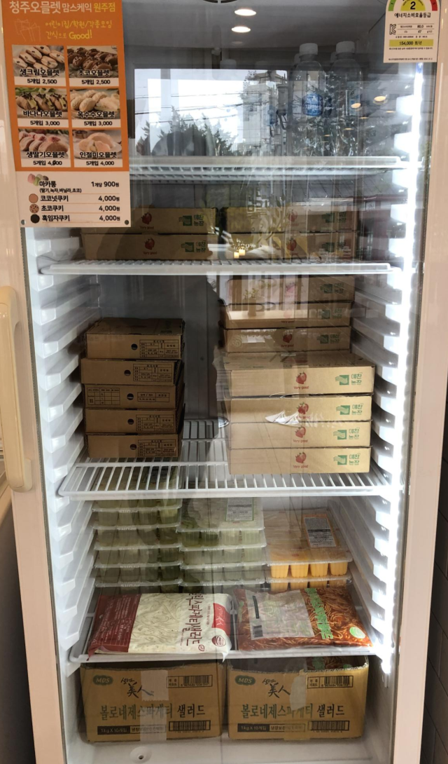 그럼, 청주오믈렛 원주점 안으로 들어가 보겠는대요, 가게 내부에는 상품이 냉장고 안에 보관되어 있고, 구매 후 간단하게 먹을 수 있는 테이블도 준비되어 있습니다.