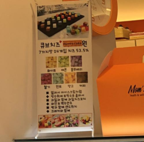 어린아이들이 있다면 특별 간식 메뉴로 큐브치즈가 있는대요, 우리 아이들도 엄청 좋아하더라고요. 7가지맛(화이트,메론,블루베리,딸기,민트,망고,커피) 24개입, 치즈 53.5% 함유하고 있다고 합니다.