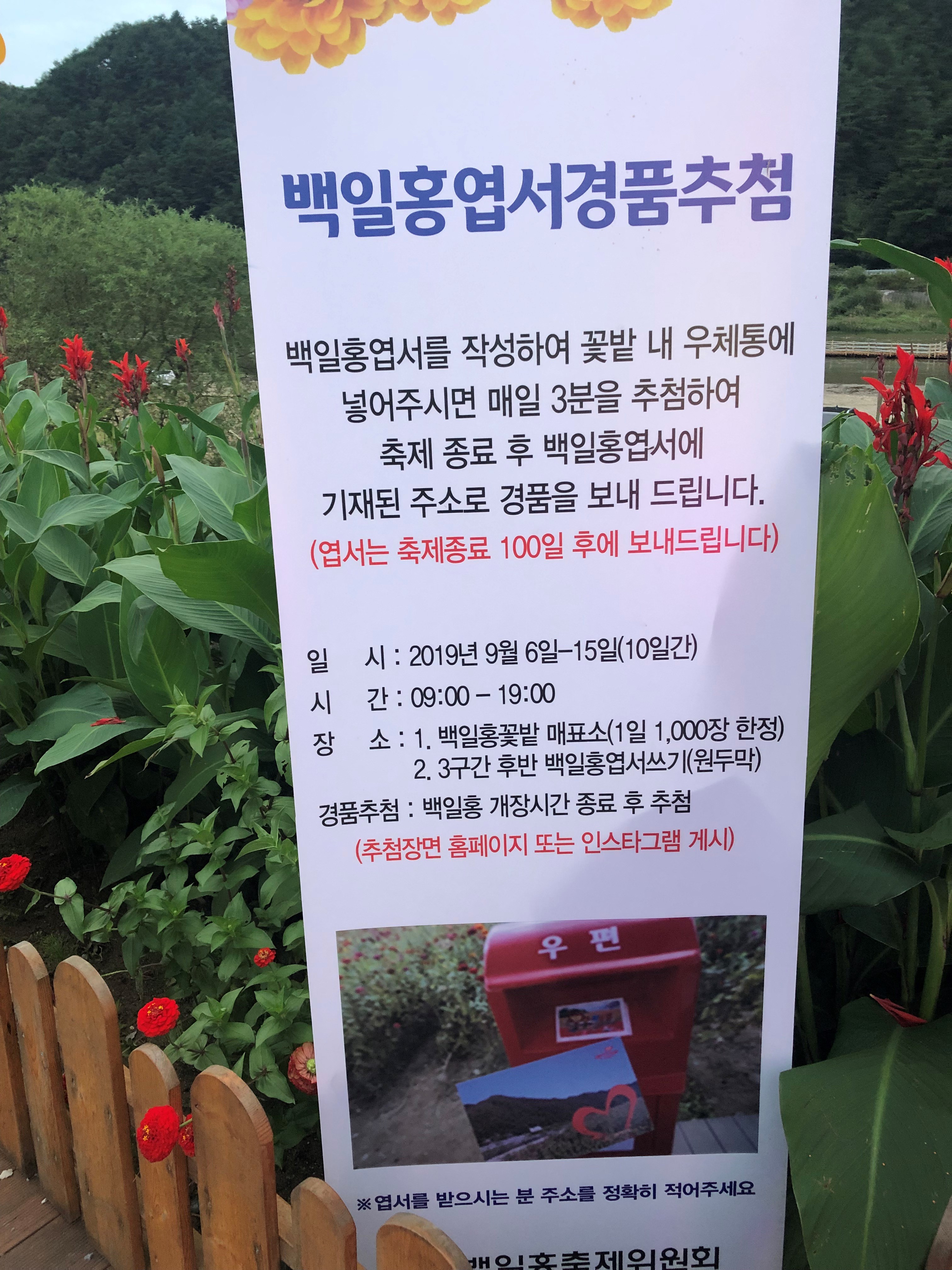 백일홍 엽서를 작성하여 꽃밭 내 우체통에 넣어주시면 매일 3분을 추첨하여 축제 종료 후 백일홍 엽서에
