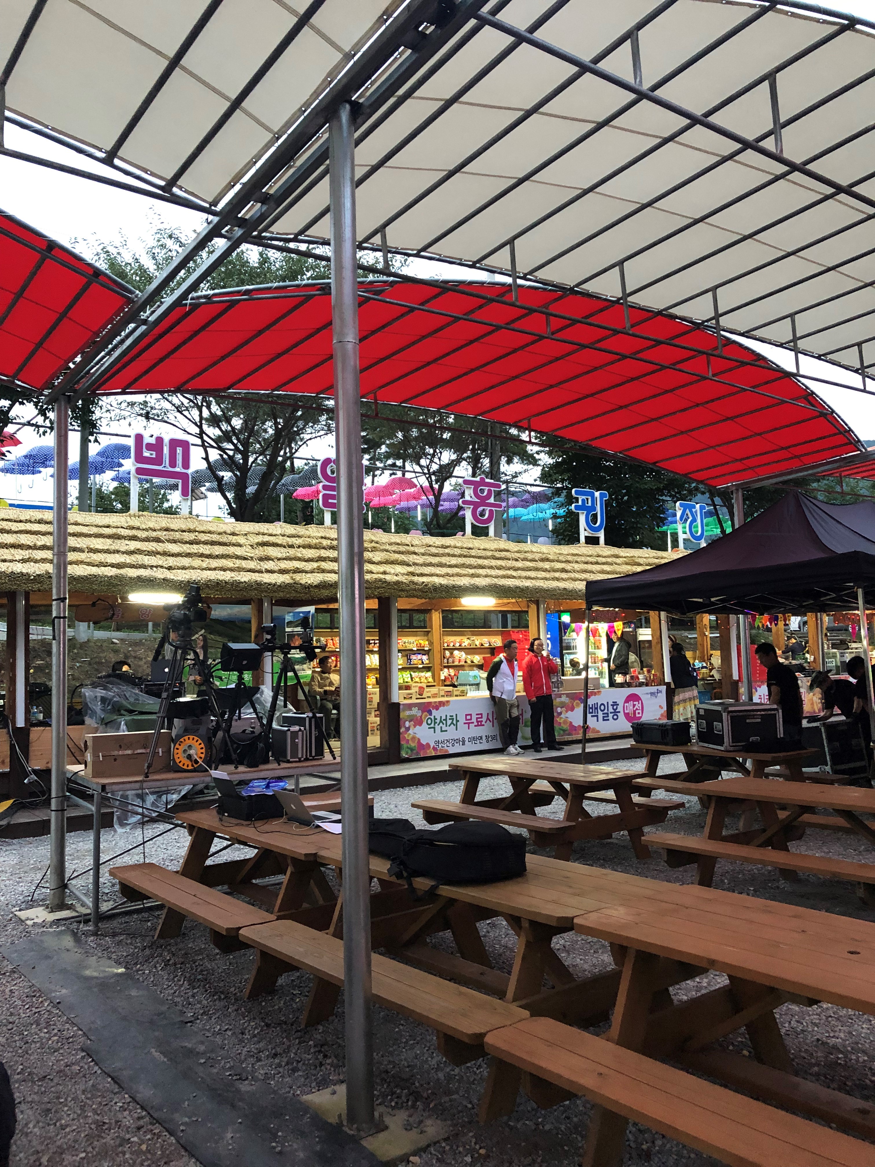 백일홍 축제 입구를 지나면 첫번째로 간이 야외 공연장이 있고 간단한 음료와 식사를 할 수 있는