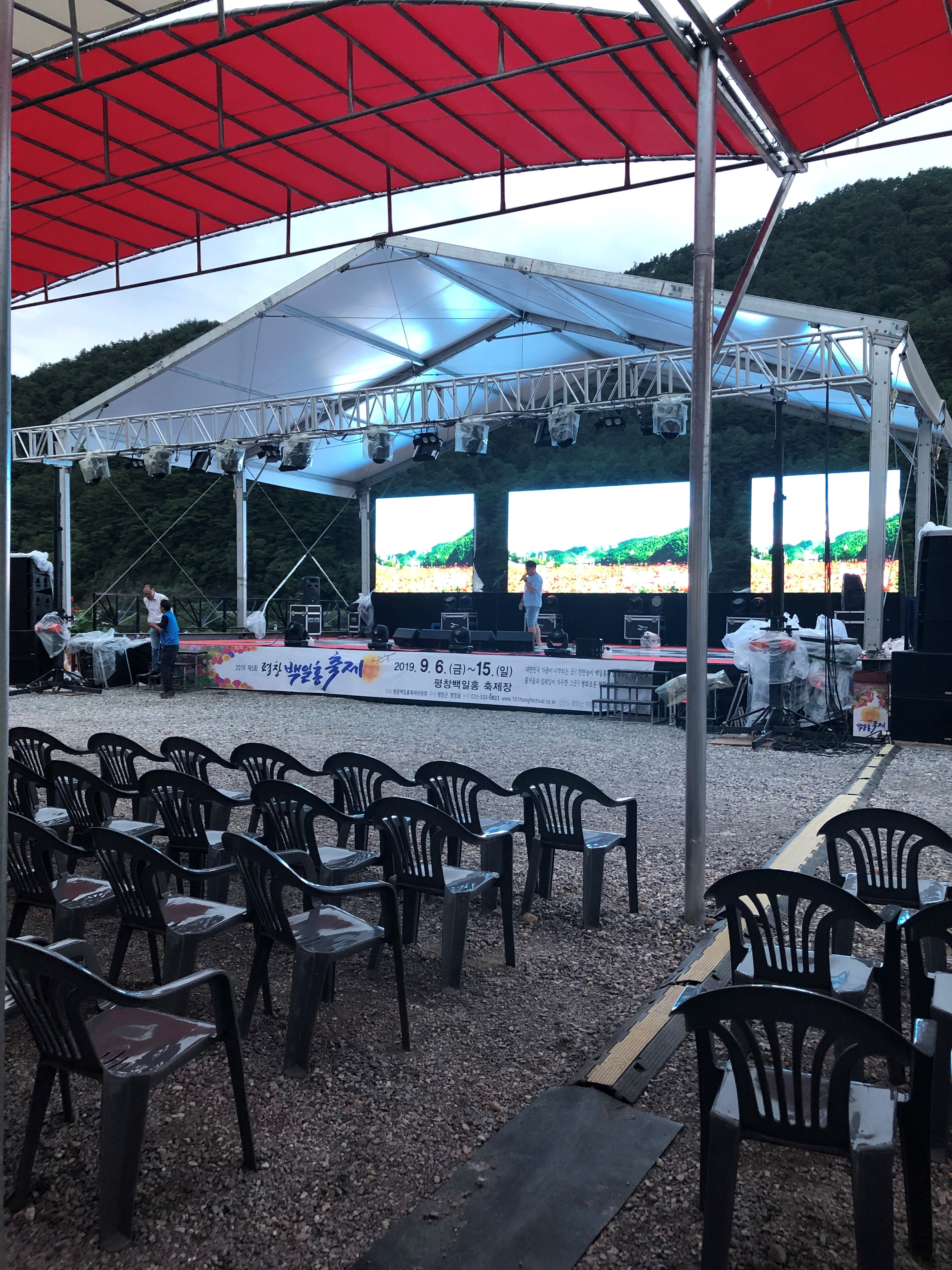야외 공연장에는 공연진행을 위하여 무대 준비와 마이크 테스트 작업이 한창입니다.
