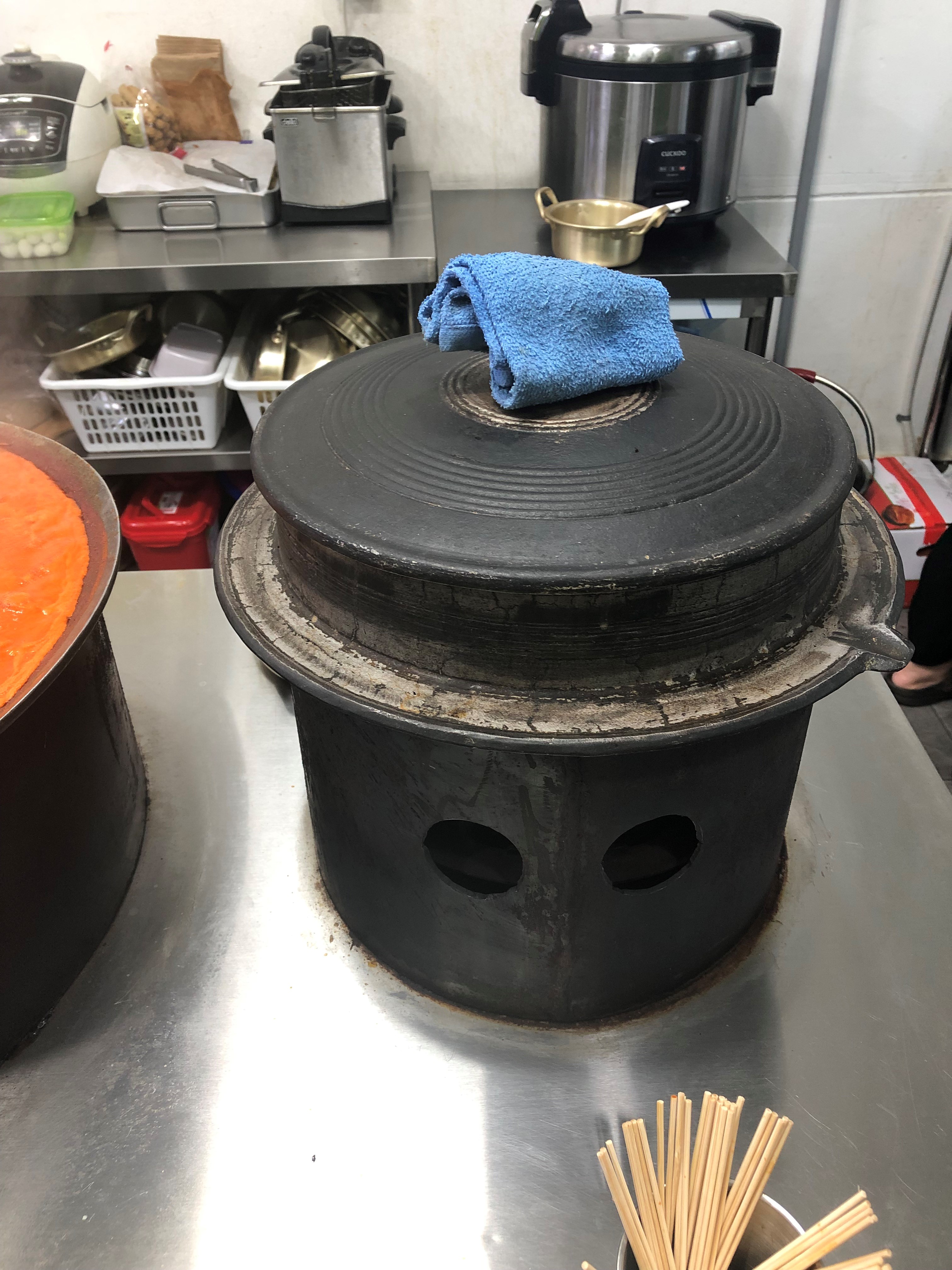 중국음식집에서 흔히 보게 되는 솥뚜껑 형식의 두꺼운 그릇에 떡과 떡볶이용 양념과 같이 끓여서 맛있는 떡볶이 국물을