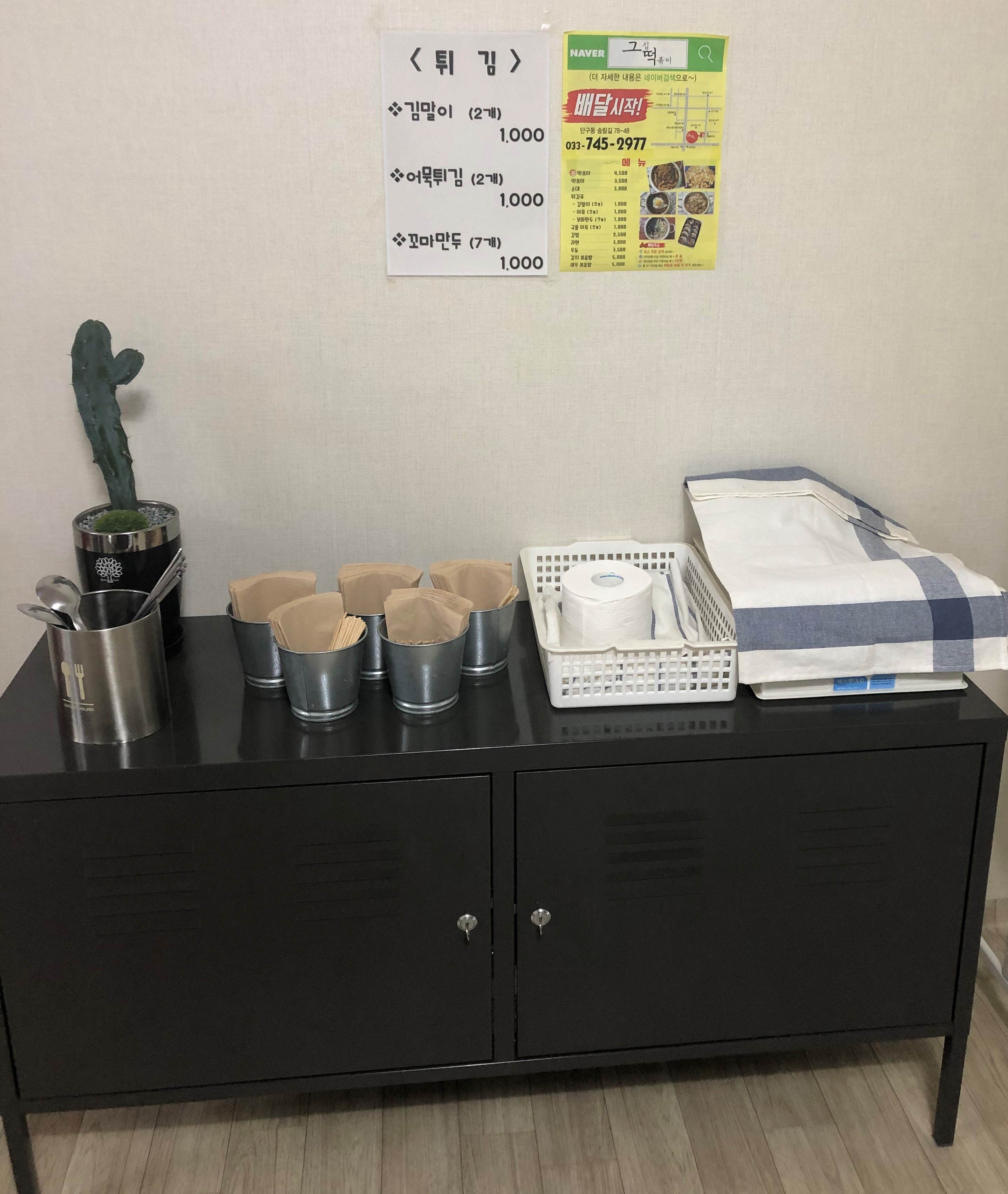 티슈 및 수저 등 필요한 품목은 한쪽 벽면 테이블 위에 비치되어 있습니다.