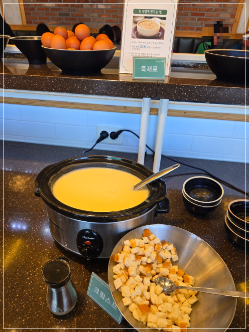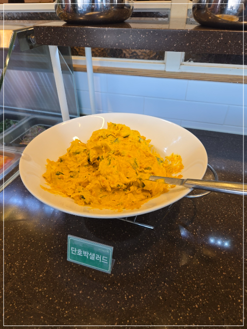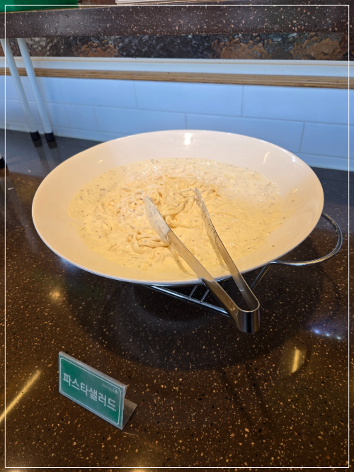 스파게티, 크림스프, 천사채샐러드, 단호박샐러드 등 맛있는 음식으로 준비되어 있다.