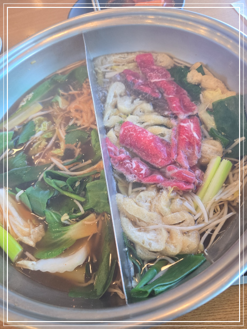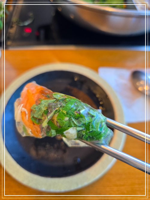 깊은맛 육수에 신선한 야채가 어우러지니 국물맛이 끝내준다.
