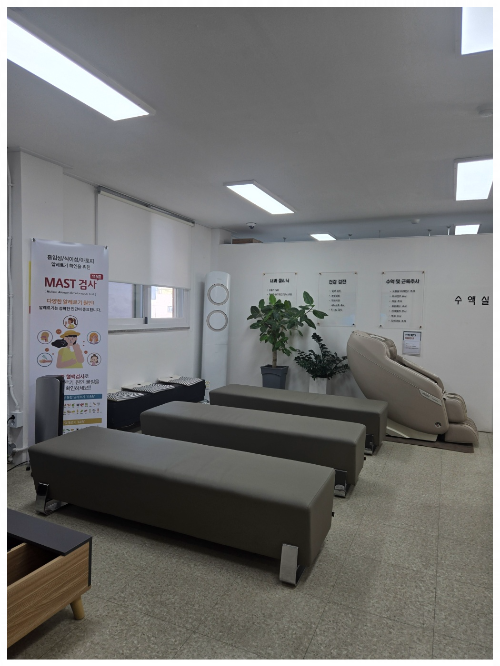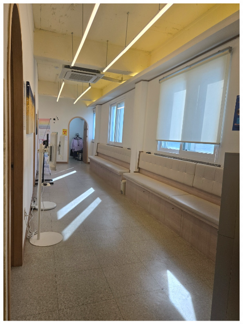 엘리베이터에서 내려 오른쪽으로 가면 넓은 대기실과 검사실, 주사실, 수액실이 있다.