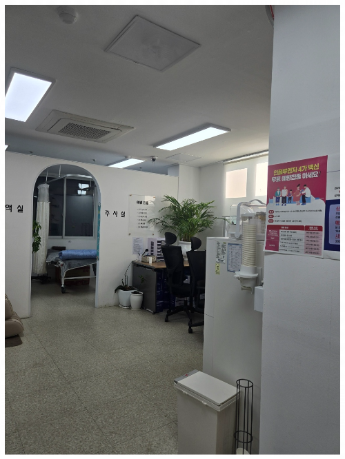 엘리베이터에서 내려 오른쪽으로 가면 넓은 대기실과 검사실, 주사실, 수액실이 있다.