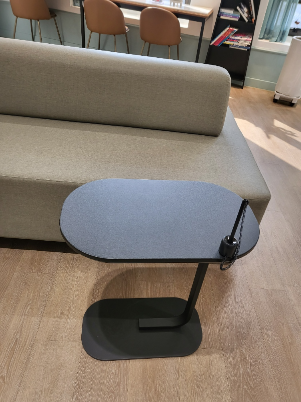 볼펜이 달려 있는 작은 테이블들이 쇼파 앞에 준비되어 있다.