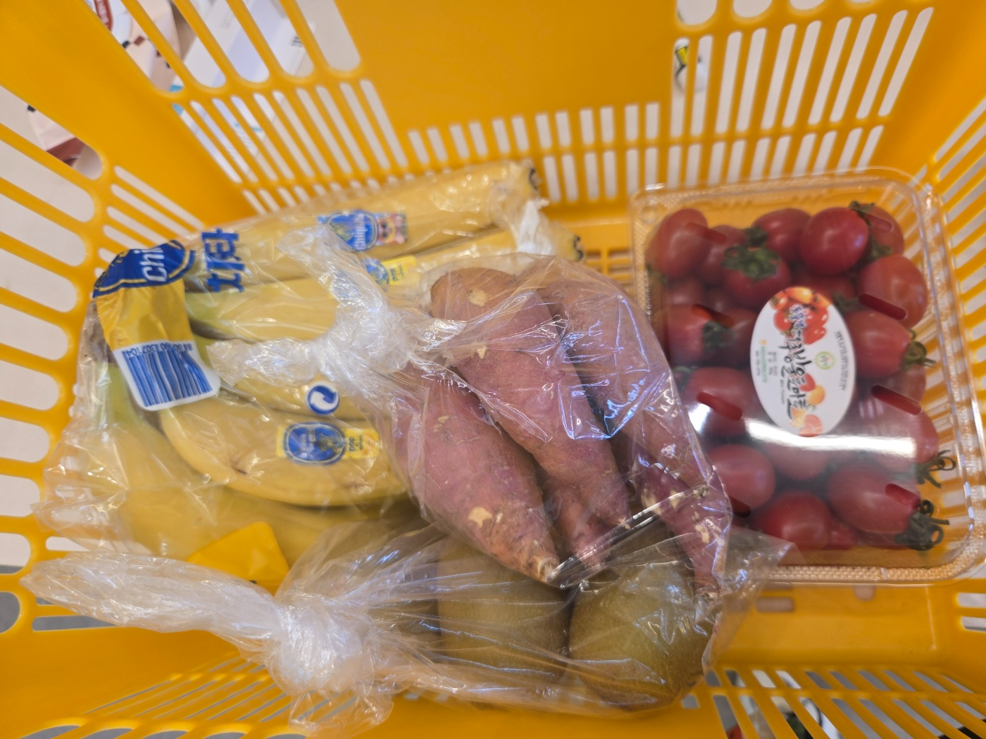 오늘 제가 구입한 건 고구마, 바나나, 키위, 방울토마토!