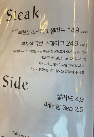 가게 전면 사진을 찍었어야 했는데 맛있는 음식을 기다리다가 메뉴판과 음식 사진만 찍게 되었습니다.