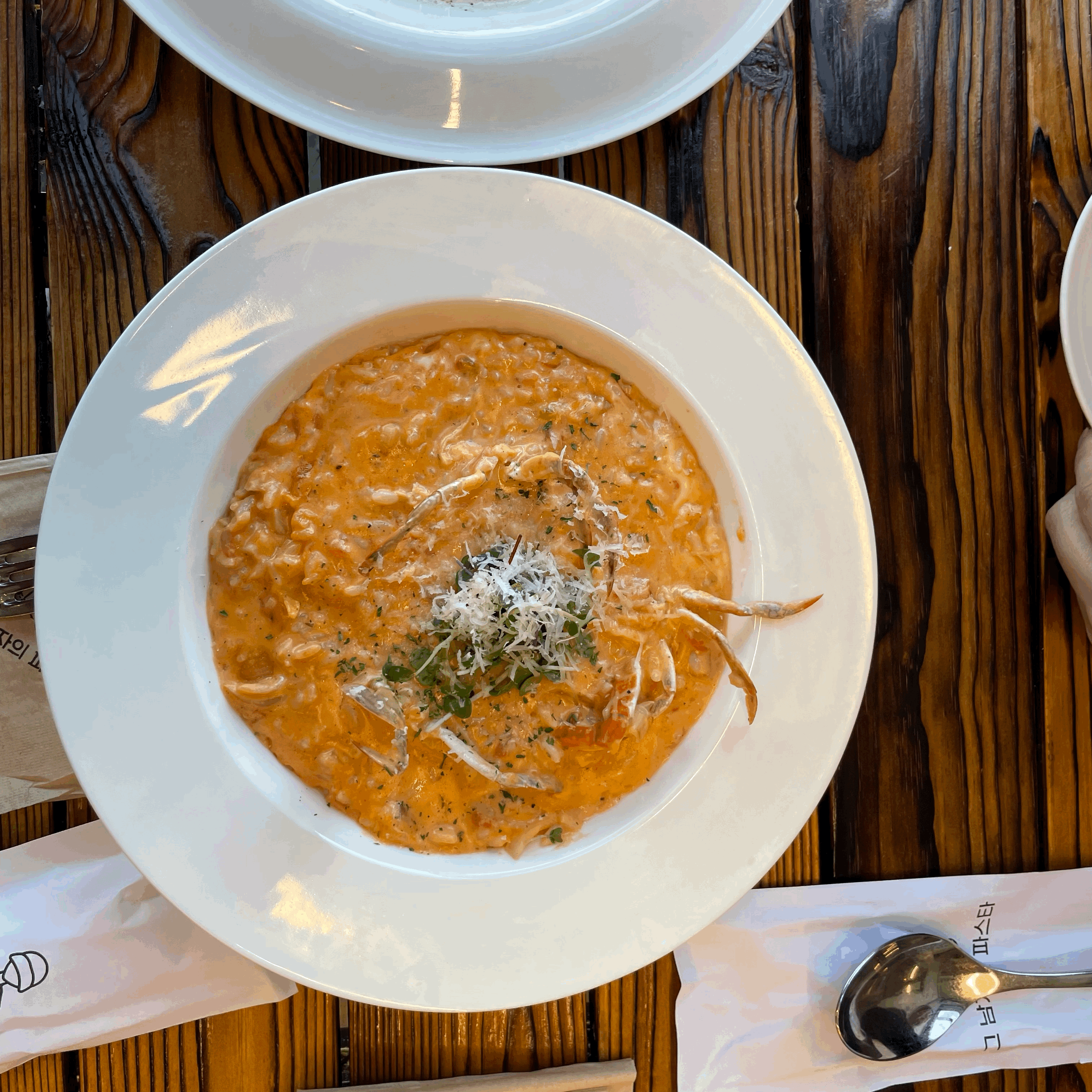 두명이 갔기에 샐러드, 까르보나라 파스타, 꽃게 로제 리조토를 주문 하였습니다.