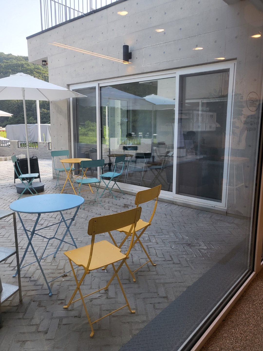 건물 옆에 잔디밭에도 테이블이 비치되어 있습니다.