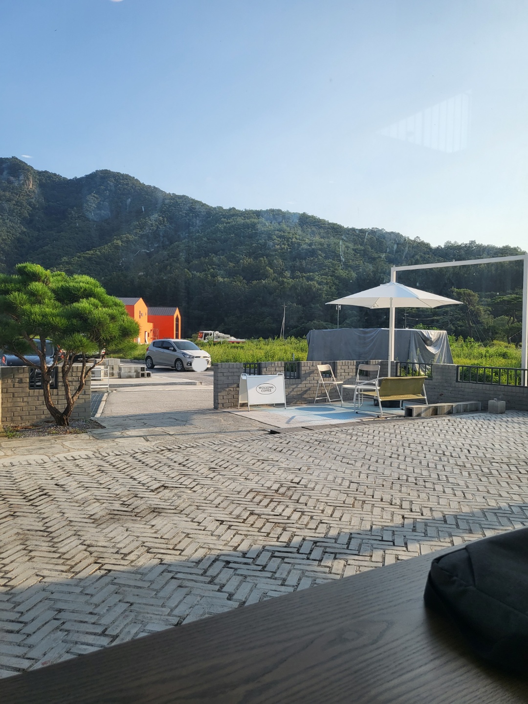 크지는 않지만 통유리창에 푸른 하늘과 푸른 산을 보면서