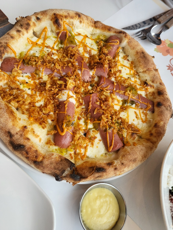 무튼 특제소스와 통소세지, 피클, 양파칩이 조화를 이룬 시그니처 피자.