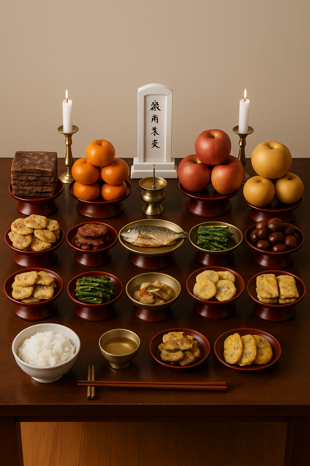 - 과일 : 사과, 배, 감, 곶감, 밤, 대추 등을 준비합니다. 과일은 홀수 개로 놓는 것이 전통입니다.