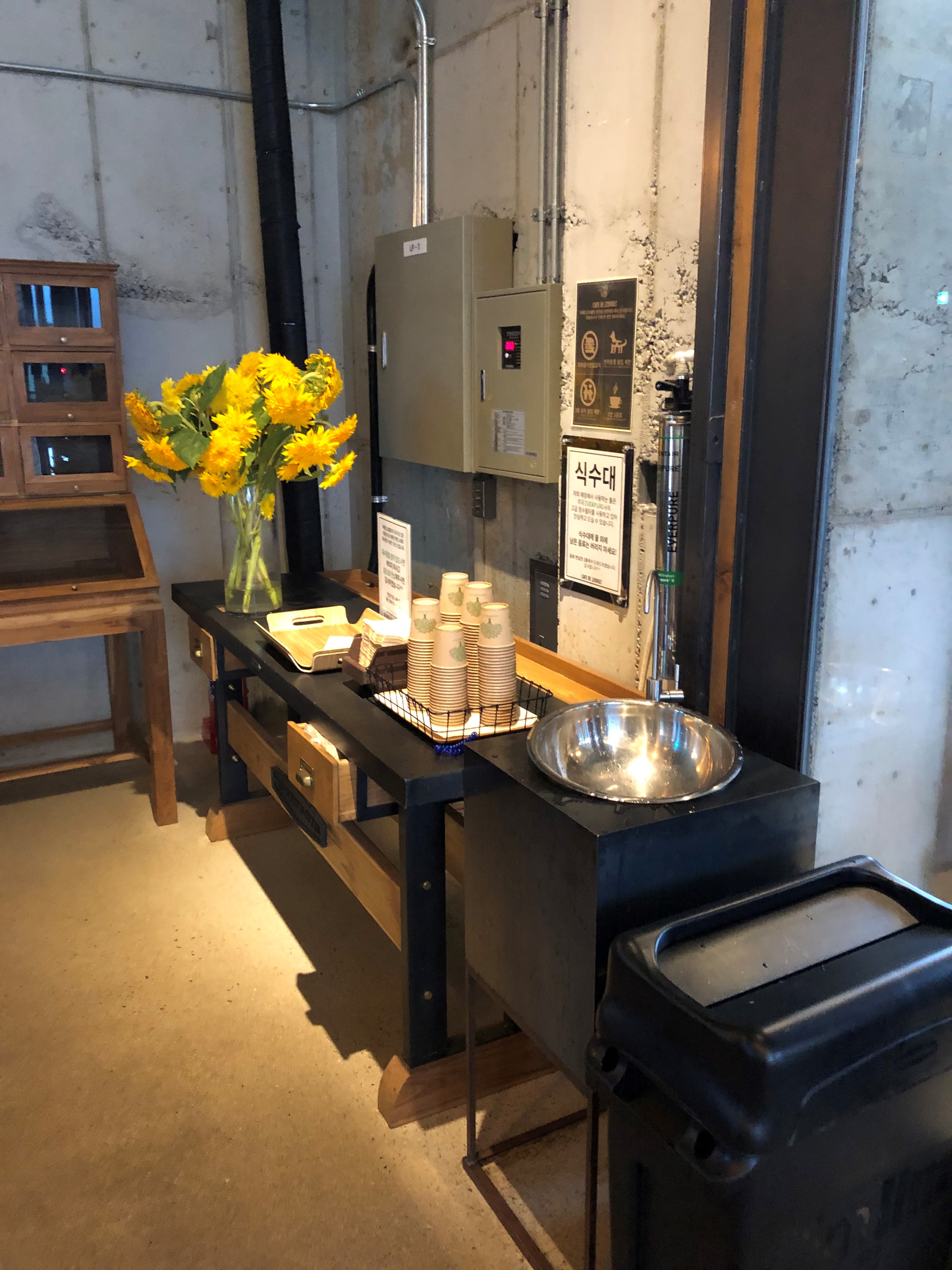 춘천 Cafe De 220Volt 에는 식수대와 정원 사이로 정원이 보이는대요,