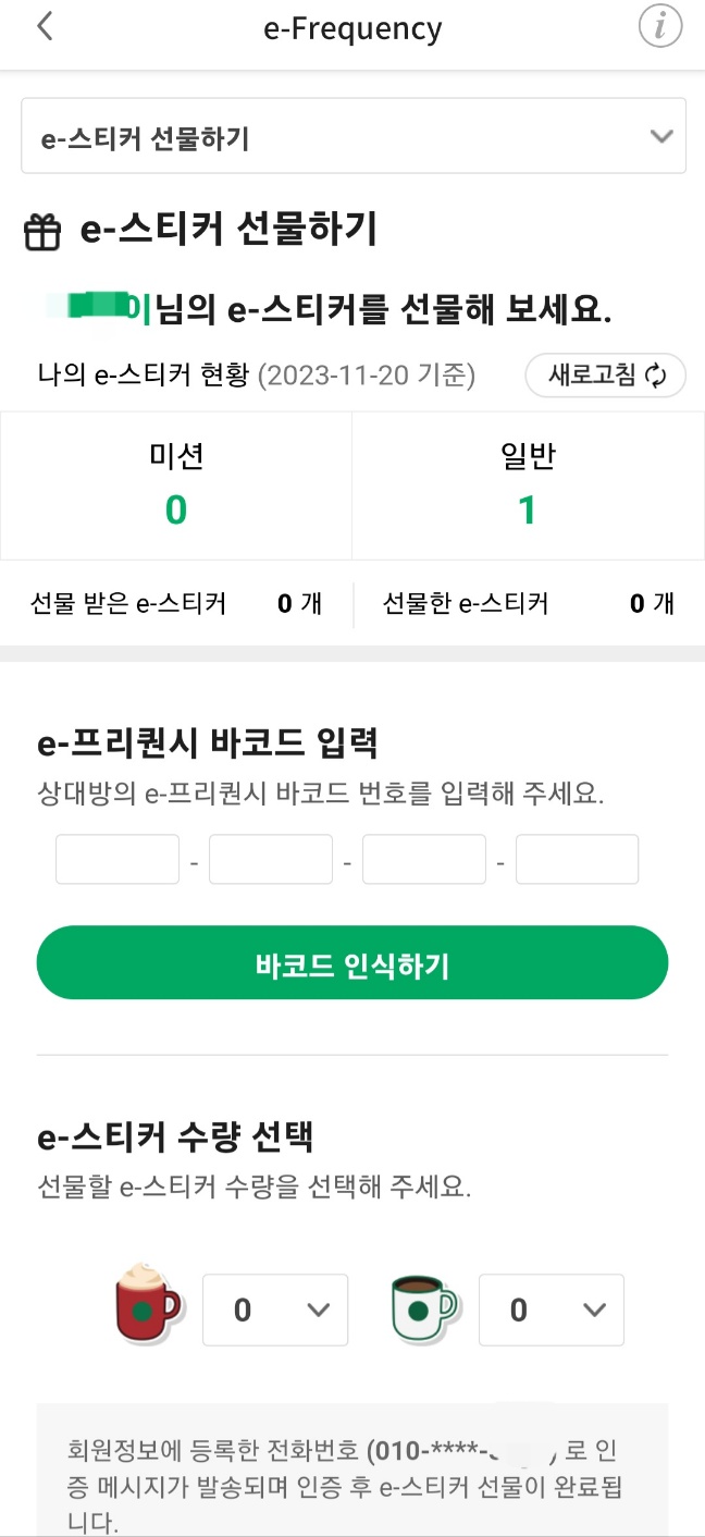 바코드 번호만 입력하면 선물하기/선물받기 모두 가능.
