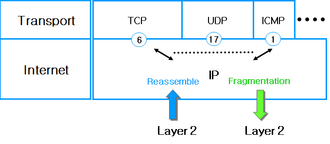 Layer2로 보낼 때는 커다란 Packet을 작은 단위의 Frame으로 분할(Fragmentation)하여 전송하며,