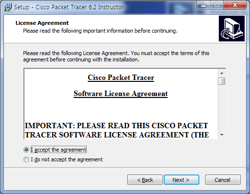 패킷트레이서 설치 파일을 실행한 후 "Next >" 버튼을 클릭한다.