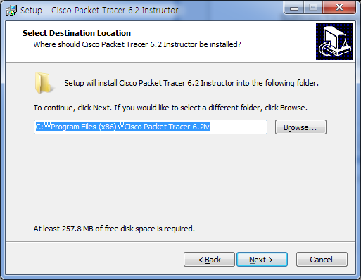 패킷트레이서가 설치될 폴더를 확인한 후 "Next >" 버튼을 클릭한다.